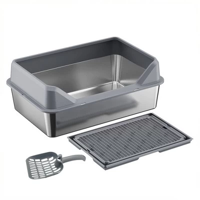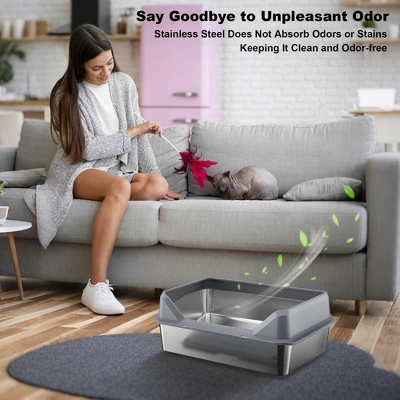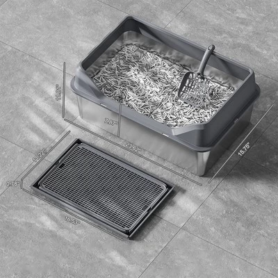 Construction: This litter box is made from quality stainless steel, ensuring durability and easy cleaning. Simply rinse with water or wipe it down to eliminate odors, featuring an electrolytic finish for a smooth, non-stick surface.Spacious and High Capacity: With dimensions of 60x40x20 cm, this litter box provides ample space for your cat. It can hold over 30 liters of litter, ensuring 3-5 days of usage without the need for frequent changes.Seamless High-Sided Barrier: Each litter box includes a seamless high side barrier, effectively doubling the surface area. Say goodbye to scattered litter and messy floors, keeping your space cleaner and more convenient to use.Hollow Cat Litter Mat: The litter mat features a unique elongated hollow design compatible with most cat litters. Its dual-layer design collects litter easily, allowing you to pour the lower layer back into the box, simplifying clean-up.Thoughtful Accessories Included: Every litter box comes with a handy litter scoop for easy litter removal, 4 silent anti-slip pads to prevent sliding and noise, and a 42×28.5×2 cm mat to catch fallen litter and keep your floor clean.Description:Name: Cat litter boxColor: Dark grayMaterial: Stainless steel +ppExpansion dimensions: 60 x 40 x 30cmObject of use: catsPacking list:Cat litter box x 1pcfence x 1pccat litter mat x 1pccat litter scoop x 1pcanti-slip mat x 4pcs