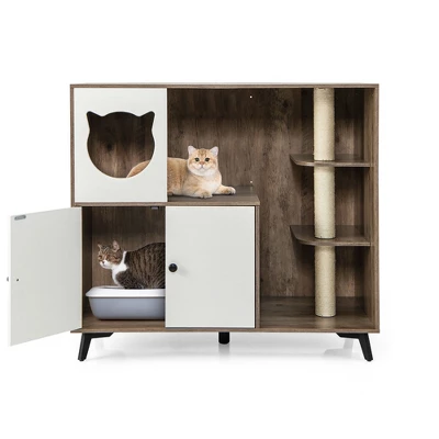 Indulge Your Cat in a World of Luxury and Exploration with This All-in-1 Cat Retreat!Our innovative cat cabinet furniture combines the functions of cat litter box enclosures and cat trees, providing a multifunctional haven for your beloved feline. There are 3 scratching posts, a hidden cat washroom, and a cat condo, offering ample space for your pet to play, scratch, relax, and toilet. The double-door cat litter box enclosure can not only provide privacy and convenience for kittens, but also minimize odors and prevent litter from scattering. Other than that, the scratching posts are covered by natural sisal ropes, making sure they are safe for your furry friends to grind paws.