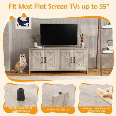 - Multifunctional Design: Not just a cat litter box enclosure or a cat house, this versatile furniture doubles as a Chic TV stand, storage cabinet, end table, coffee table, or even a console table. The large tabletop allows it to fit most flat screen TVs up to 55″.