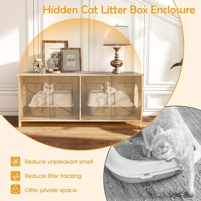 Create a Comfortable and Discreet Area for Your Lovely Furry Friends!Our double-room cat litter box enclosure, measuring 48″ x 20″ x 20″/120 x 50 x 51 cm (L x W x H), offers ample space for either 2 litter boxes or a litter box and a cozy bed, accommodating the needs of multiple cats with ease. The enclosed area could effectively minimize odors and prevent litter from being tracked outside, ensuring a cleaner and more pleasant living environment. Constructed with care, the cabinet adopts a middle reinforced supporting leg and anti-slip footpads for stability, along with waterproof veneered surfaces for easy maintenance.