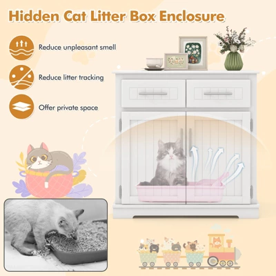Upgrade the Living Environment of Your Lovely Furry Friends!Our wooden cat litter box enclosure is designed to cater to both your needs and your feline companion’s comfort. Serving as more than just a hidden cat washroom, this stylish furniture piece doubles as a practical side cabinet or a cozy cat hideaway, ensuring your furry friend has a comfortable and private space. Besides, it comes with 2 deep drawers and a large countertop to keep all your cat essentials neatly organized. The bottom cabinet could not only conceal the litter box, but also reduce odors and prevent litter spillage, maintaining a clean and fresh living environment.