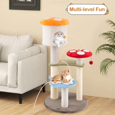 Treat Your Cat to the Ultimate Playground!Our 48″ tall vibrant mushroom cat tree adopts a charming mushroom-inspired design, which could add a touch of whimsy to your home decoration, making it a delightful and engaging addition that both you and your cat will adore. It comes with a top cat condo, 3 padded platforms, and a large platform, providing a luxurious retreat for cats to lounge, overlook, nap, and play. And all platforms are covered in soft plush fabric, making the cat tower warm and cozy to lie on. More than that, it includes fully-wrapped scratching posts and a plush dangling ball, keeping your cat entertained and active.
