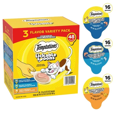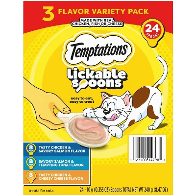 Your feline’s favorite cat treat brand can be enjoyed in a Lickable Spoon format! Stir up some delicious moments with your furry best friend with TEMPTATIONS Lickable Spoons Tasty Chicken and Cheesy Cheese flavor, Savory Salmon and Tempting Tuna flavor, and Tasty Chicken and Savory Salmon flavor lickable wet cat treats. The creamy treat comes in a specially designed spoon and combines two tasty flavors. The purr-fect spoon size makes it easy to eat and easy to treat your cat for a memorable bonding experience. TEMPTATIONS Lickable Spoons can also be used as a meal complement to make mealtime extra special. TEMPTATIONS Spoons, with added vitamins and minerals, have no fillers or artificial flavors. Enjoy treat time with your furry feline, one spoon at a time!