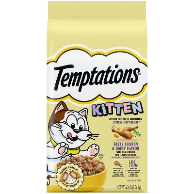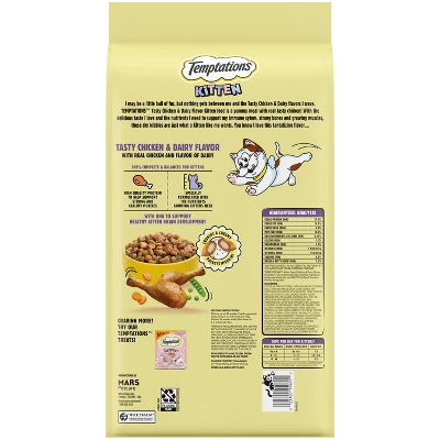 - 6.3 lb. Bag: Contains one (1) 6.3 lb. bag of Temptations Dry Kitten Food Tasty Chicken & Dairy Flavor.