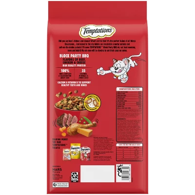 - Contains one (1) 6.3 lb. bag of TEMPTATIONS Block Party BBQ Flavor Adult Dry Cat Food