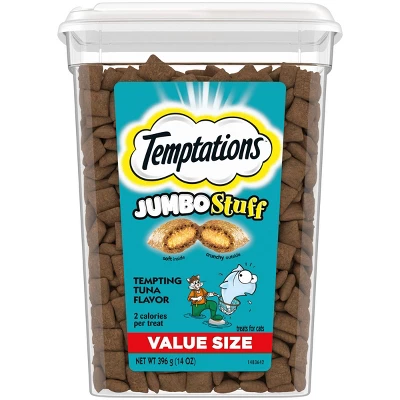 Cats love the delicious taste of Temptations Classic Cat Treats, so give your cat more of what they love with Temptations Jumbo Stuff Tempting Tuna Flavor Cat Treats. Just shake the pack, and they’ll come running. Each of these tasty tuna flavor cat treats is 2 calories and provides an irresistible combination of both crunchy and soft textures. These cat treats also come in a resealable, value-sized tub, so your feline friend can enjoy their favorite cat snacks when you open them, but not when they shouldn’t! Temptations Jumbo Stuff cat treats are the perfect large treat addition to your cat’s regular feeding routine – use them as a treat, a meal, or a cat food topper. Temptations Jumbo Stuff cat treats are the purr-fect way to show your feline friend how much you care.