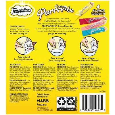 - 48-Pack: Contains twelve (12) 0.42 oz. tubes of Temptations Creamy Puree Squeezable Lickable Wet Cat Treats with Beef Liver and twelve (12) 0.42 oz. tubes of Temptations Creamy Puree Squeezable Lickable Wet Cat Treats with Chicken and twelve (12) 0.42 oz. tubes of Temptations Creamy Puree Squeezable Lickable Wet Cat Treats with Salmon, and twelve (12) 0.42 oz. tubes of Temptations Creamy Puree Squeezable Lickable Wet Cat Treats with Tuna.