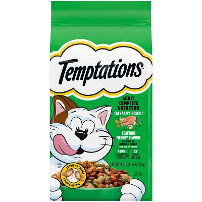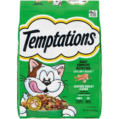 - Cats Can’t Resist: Your cat will be thrilled to get a taste of TEMPTATIONS Seafood Medley Flavor adult cat food; this dry cat food offers high-quality protein and the delicious flavors of salmon and shrimp
