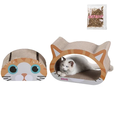 Keep your cats active and healthy with our two-piece scratch and play set. The adorable cat head design is made from corrugated cardboard that kitties love. Simply pull out the center to create a cat cave for stalking or hiding out.