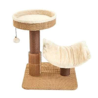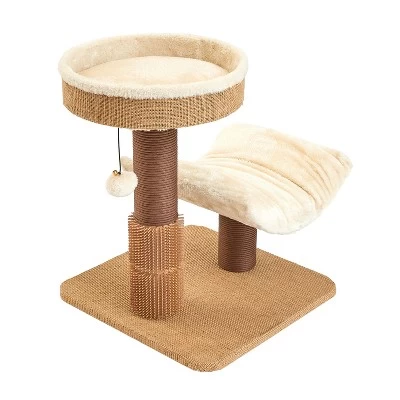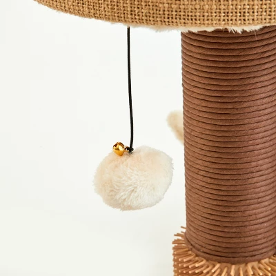Compact cat tree offers options for playing, scratching and lounging. Curved platform invites your cat to curl up and get cozy. Platform is perfect for perching. Sturdy scratching post also offers cat-attracting bristles to brush up against. Attached toy for playtime. Made with eco-friendly and recycled materials.