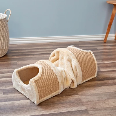The Two by Two New York Cat Tunnel, Condo with Scratching Surface provides many levels of activity and play for your cat. Two Condos covered in Jute for scratching. A two foot long Tunnel connects each condo. Play hide and go seek, peek a boo, then end the day with a good scratch session, all before a nice long nap in one of he two condos. No assembly required. Portable and easy storage. 42x11x15 inches.