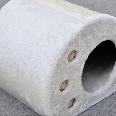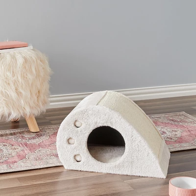 Compact cat toy condo and scratching station offers cozy comfort and exciting activity for your feline friends. Embedded balls with bells are good for hours of cat playtime. Sisal scratching board keeps cats away from your furniture. Comfy condo gives your cat a cozy space to rest, sleep or hide. Small enough to tuck away when not in use. Plush cream fabric blends with any decor. 11.8 inches tall by 11.8 inches wide.