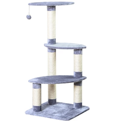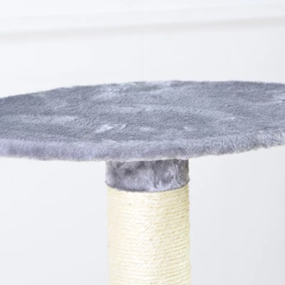 This large 4-level 41-inch tall cat tree offers multiple places for your cat to land. Two different 18.5 inch platforms and one 23.6 inch platform are at different heights and angles to give your cat various perspective options. Platforms and sturdy base are covered in plush grey fabric. Three scratching columns are wrapped in sisal and will keep your cat’s claws away from furniture. Durable construction and long lasting materials mean years of use for your cat. Great for multi-cat households. Quick and easy assembly.