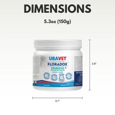 Transform your pet’s health with UBAVET Floradox Probiotic Powder, a superior supplement designed to support immune function and maintain a balanced gut microbiome in dogs and cats. Each 4-gram serving is enriched with a powerful blend of probiotics, including Lactobacillus and Bifidobacterium strains, delivering an impressive one billion CFUs per gram. This ensures your pet has the friendly bacteria essential for optimal digestion and metabolism.Floradox doesn’t stop at gut health; it features natural ingredients like Brown rice and Spirulina that enhance overall wellness. Just mix this easy-to-use powder into your pet’s food, and watch as they thrive with improved digestion and a stronger immune system.Give your furry friends the gift of health with Floradox Probiotic Powder. Perfect for pets of all ages, this probiotic formula will help them live their best, happiest lives—because every wag and purr deserves a strong foundation of health!Dimensions: 3.7″x3.9″Item Weight: 0.46 lb