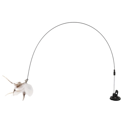 - This cat teaser is in the form of a feather pendant design with a bell and a suction cup