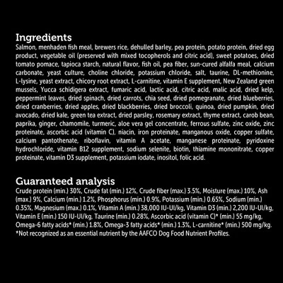 - Omega-3 and omega-6 from salmon, vegetable oil and fish oil for a healthy skin and coat.