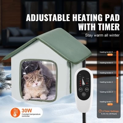 Secure Heating Pad: This heated cat house features a 30W waterproof heating pad that provides a 19°C /66.2°F temperature increase, and allows for timer settings of 4/8/12/24 hours, ensuring your pet stays warm for winter or cold climates. With built-in power failure protection and an intelligent thermostat, it offers over-temperature and over-current protection. (Note: The heating pad requires about 10 minutes to warm up—please be patient as it heats.)