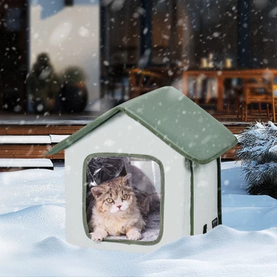 High Waterproof Capability: Constructed from 600D Oxford cloth, the interior features PVC waterproof coating on all six walls. The entrance includes a PVC curtain to minimize moisture and cold air intrusion, ensuring a comfortable outdoor heated pet shelter during rain or winter. The heating cord is wrapped in chew-proof material to prevent animals from biting it, making it a reliable waterproof heated cat house.