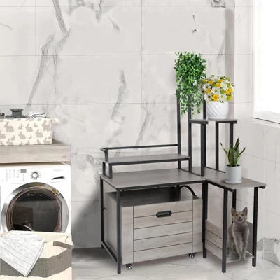 Versatile Cat Litter Box Enclosure with Smart StorageThis innovative corner-style litter box enclosure combines discreet pet care with elegant home decor. The dual-functional design serves as both a hidden litter station and decorative flower stand, featuring:• Privacy-Focused Design: Enclosed structure creates a secure potty area, shielding cats from disturbances while preventing dog access• Smart Corner Solution: Space-saving 2-in-1 cabinet and display stand with two-tier storage shelf (ideal for pet supplies or decor)• Effortless Maintenance: Smooth-rolling pull-out drawer system simplifies litter changes and interior cleaning• Convertible Interior: Spacious 23.6″L x 17.7″W x 23.6″H chamber accommodates standard litter boxes or can be converted into a cozy cat bed• Practical Features: Includes entrance PVC mat to trap tracked litter and sturdy metal casters for mobilityDimensions: 36.8″L x 31.5″W x 51″H | Weight Capacity: 150 lbs | Recommended for: Cats ≤12 lbsDesigned for discerning pet owners, this multifunctional piece maintains home aesthetics while solving practical pet care challenges.