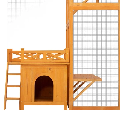 Specification:Product Name:Outdoor Cat house Main Color:BrownMain Material:Pine,PVCMORE SPACE: It features 6 long platforms, 2 bridges to run across, 2 ramps to climb up or down, and 2 sleeping houses at the tippy tops in the corners.MORE THOUGHTFUL: Cats will be able to enjoy being outside even in the rain cause  transparent PVC roofs give weather protection.