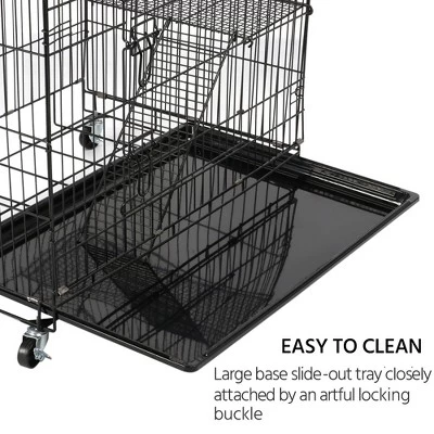 - This 4-tier cat cage has a well-built structure made of harmless finished iron and measured 31.5x22x48.4″(LxWxH). As a detail-oriented pet cage, it boasts a sturdy staircase, quality hammock/bedding, easy-to-clean litter tray at the bottom, secured cage lock and brake casters, which makes it an ideal choice of rolling cage for pet parents. Also, the cage applies user-friendly construction and comes along with easy-to-read worry-free assembly instructions in the package.