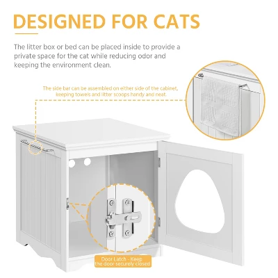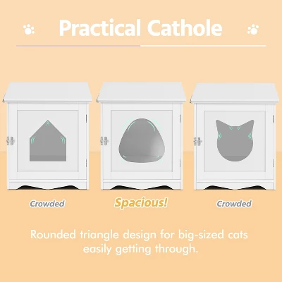- If you want a smart and attractive way to conceal a cat’s litter box, this enclosed cat litter box table will be the ideal choice. Not only hide the litter box inside and also match other home furniture, fitting most litter boxes. This table serves well as a side table, a decorative cat litter box, or a pet house. The tabletop can be a good place for your lovely ornaments or can be a small platform for your pet to rest on. Plus, there is a cat hole on the door panel, easy access for a cat going in and out.